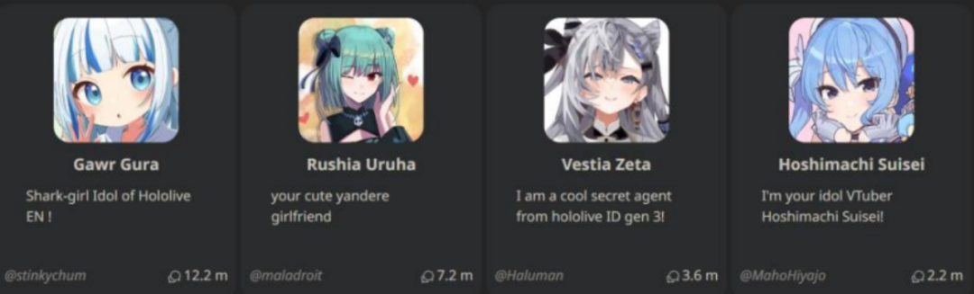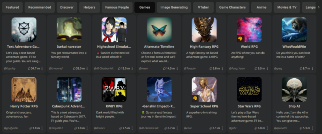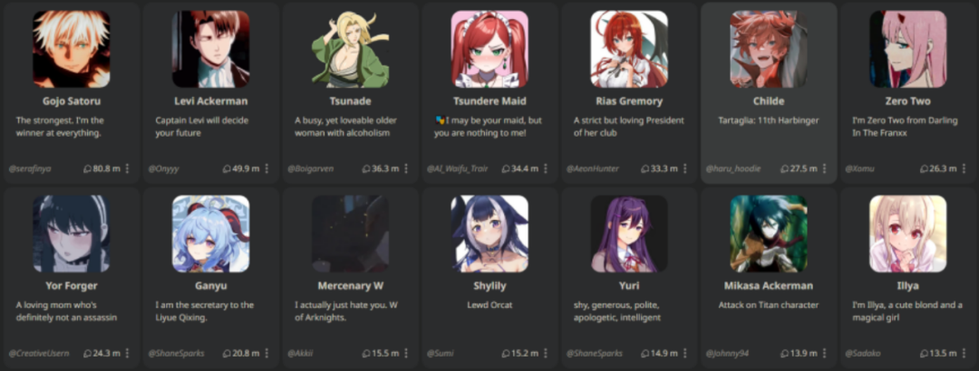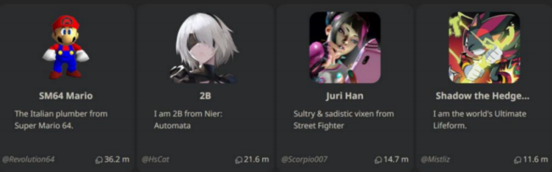 游戏动漫类角色占绝对的优势地位,似乎说明玩Character.ai的主要是二次元爱好者。
