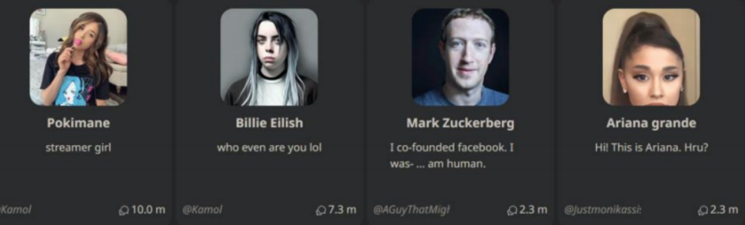 在现实名人赛道,排名前四的是加拿大Twitch主播Pokimane、美国歌手Billie Eilish、脸书创始人扎克伯格和美国歌手Ariana Grande。