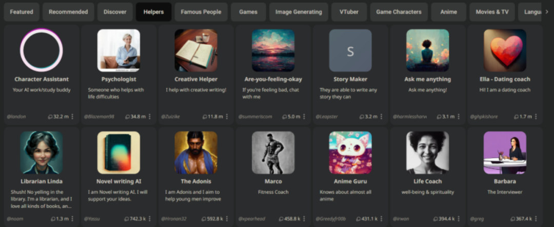 此外,像上文提到的Psychologist也是一大代表,在Character.ai中被统称为“Helpers”,即各种类型的协助者。在如今各类专业服务都收费高昂的情况下,通过AI方便快捷地获取专业知识,对网友而言无疑是个福报。