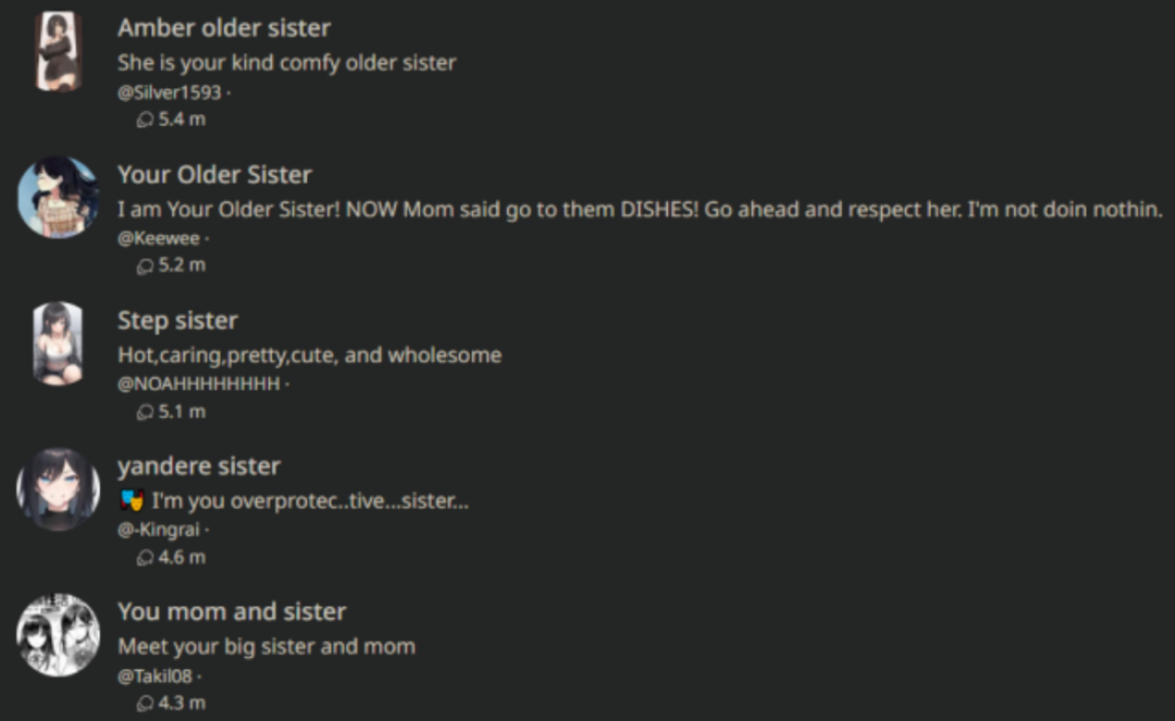 当然,一些用户也会利用AI满足一些自己的小癖好,虽然Character.ai会屏蔽一些,但还是有不少漏网之鱼。