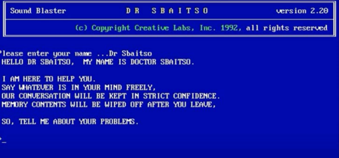 1992年,Dr. Sbaitso的出现标志了聊天机器人从文本走向语音的关键转折。它是Creative Labs于1992年为MS-DOS创建的聊天机器人,是将 AI 融入聊天机器人的最早尝试之一,并以其全语音操作的聊天程序而闻名。