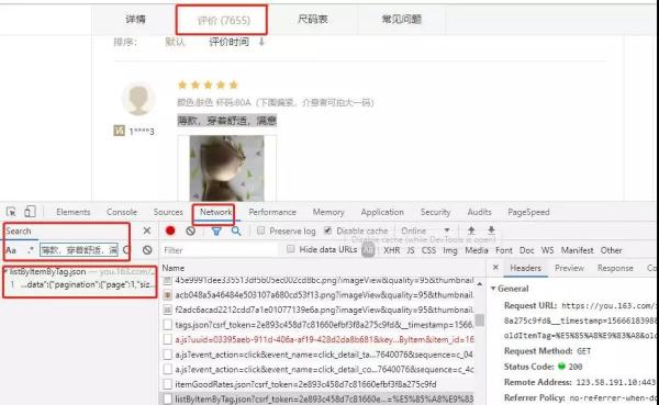 在商品页面,打开 Chrome 的控制台,切换至 Network 页,再把商品页面切换到评价标签下,选择一个评论文字,如“薄款、穿着舒适、满意”,在 Network 中搜索。