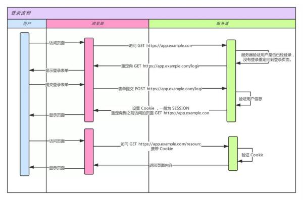 在介绍单点登录之前,我们先来了解一下在浏览器中,访问一个需要登录的应用时主要发生的一系列流程,如下图所示: