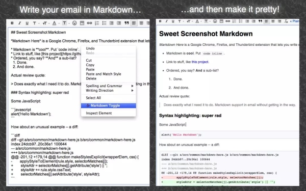 markdown here chrome插件是一款功能强大的文本编排插件。markdown here能够允许你在发送电子邮件之前用Markdown语法编辑并转换它,将编辑器里的Markdown文本转换成渲染过后的html,支持多种格式。