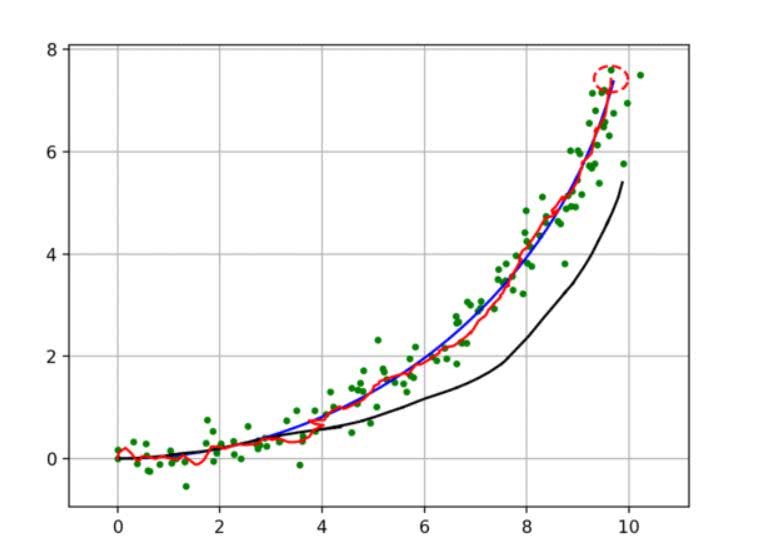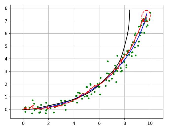 这是使用扩展卡尔曼滤波器(EKF)的传感器融合定位。蓝线是真实的轨迹,黑线是推算的轨迹,绿点是定位观测(例如 GPS),红线是 EKF 的估计轨迹,红色椭圆是 EKF 估计的协方差椭圆。