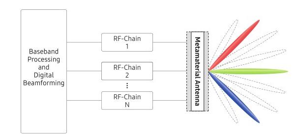 第二种方法:超材料天线作为谐振天线,其自身辐射定向波束,与超表面透镜不同,它不需要一个带移相器的独立天线阵列。
