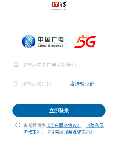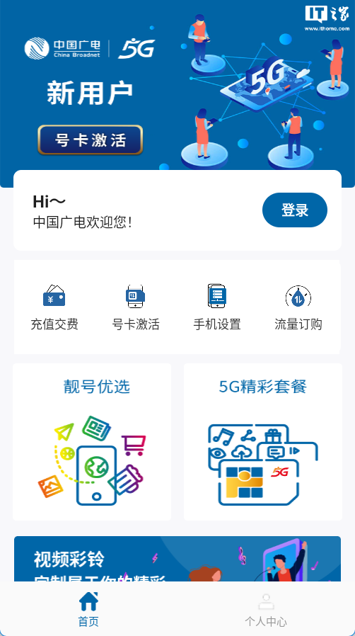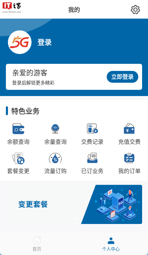 IT之家体验发现,中国广电App界面较为简洁,底栏只有首页、个人中心两个选项,用户登陆中国广电手机号后,可以进行充值交费、流量订购、余额查询、套餐变更等操作。