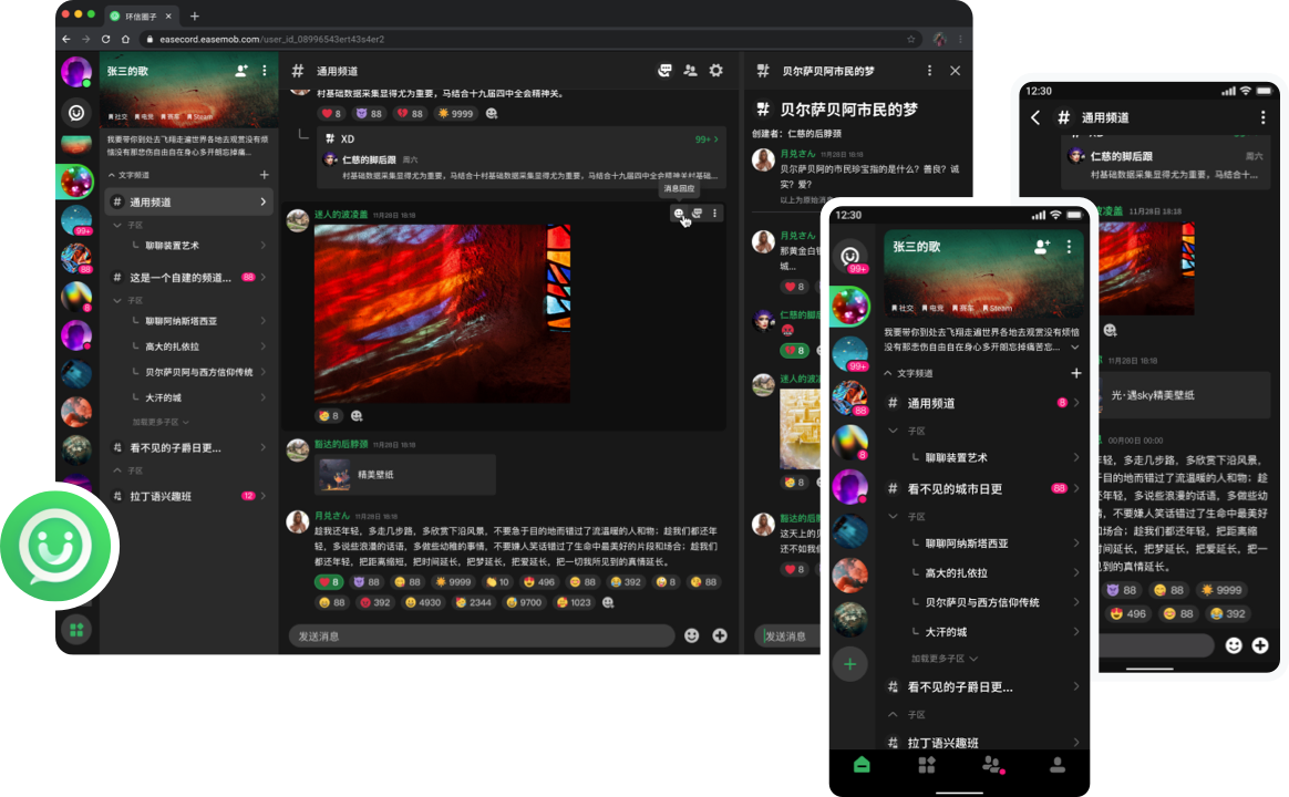 - 支持Thread, Reaction,用户在离线状态显示等Discord场景特色功能